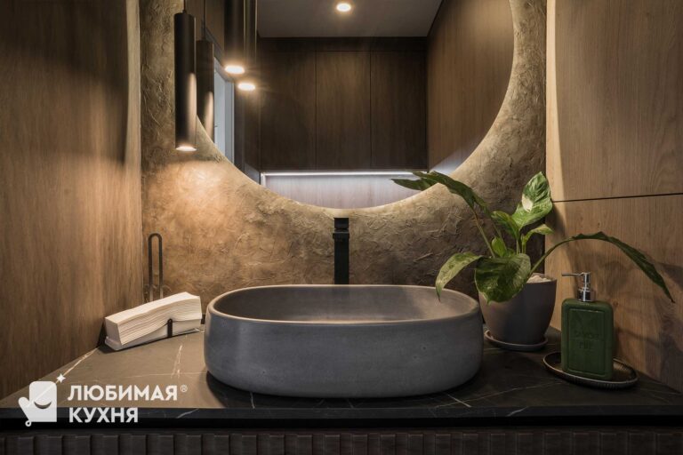 Брутальный санузел для любителей находится в уединении. Брутальная тумба с вместительными ящиками под раковину с металлической опорой и рифлеными фасадами плавно переходит в невероятно вместительные пеналы, в которых предусмотрены системы хранения. Над инсталляцией — полка с подсветкой и шкафом. Каждый сантиметр данного санузла использован по максимуму благодаря грамотной планировке.