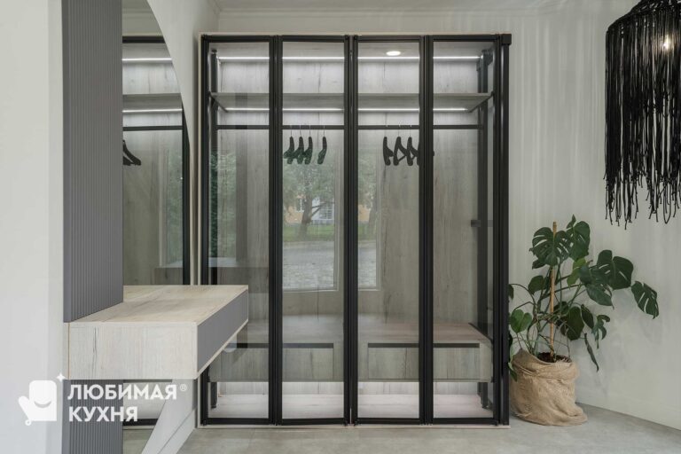Изящный шкаф в стиле современная классика прекрасно вписывается в пространство спальни. Тончайшая фрезеровка и сдержанный цвет выглядят невероятно легко и красиво. Шкаф встроен в нишу, что маскирует его глубину и позволяет избежать членения пространства.